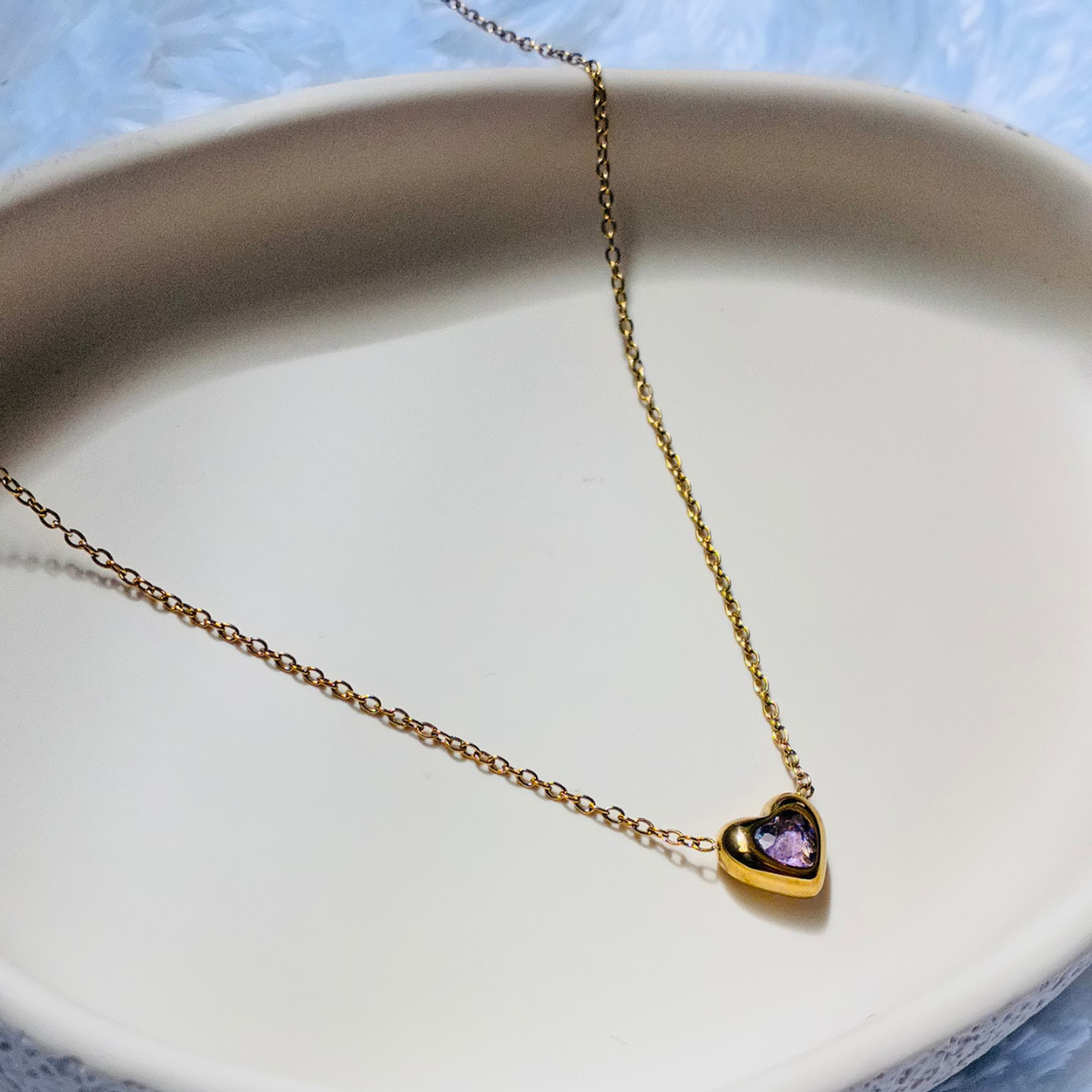A delicate gold-tone necklace featuring a minimal heart-shaped pendant with a subtle stone accent for a soft, elegant look.