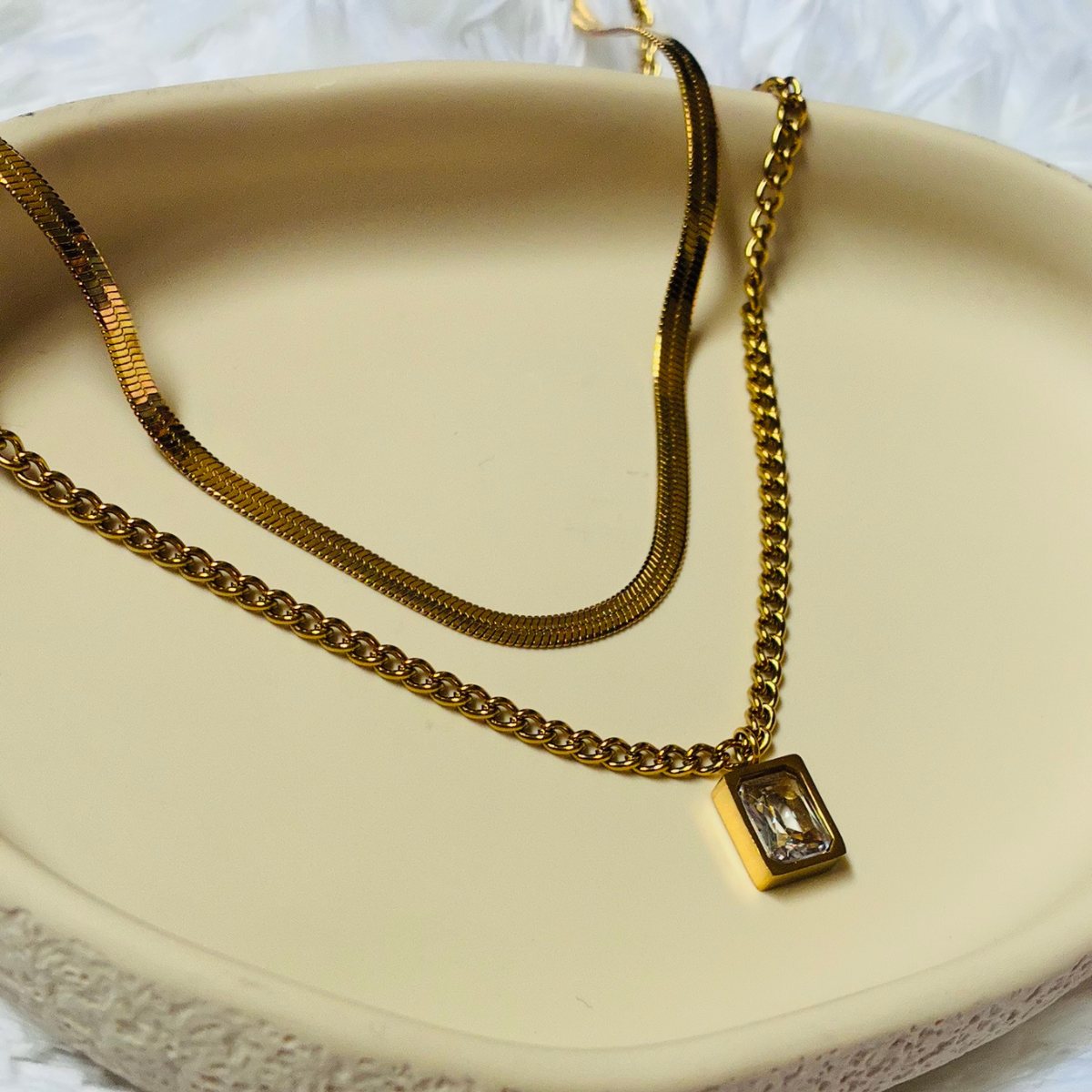 A refined double-chain necklace featuring a sleek gold-tone finish with a subtle crystal accent.